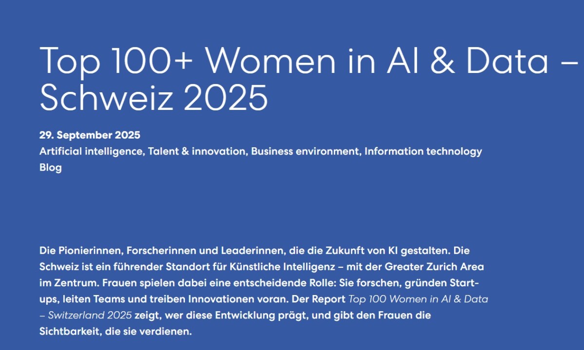 Die Pionierinnen, Forscherinnen und Leaderinnen, die die Zukunft von KI gestalten. Die Schweiz ist ein führender Standort für Künstliche Intelligenz – mit der Greater Zurich Area im Zentrum. Frauen spielen dabei eine entscheidende Rolle: Sie forschen, gründen Start-ups, leiten Teams und treiben Innovationen voran. Der Report Top 100 Women in AI & Data – Switzerland 2025 zeigt, wer diese Entwicklung prägt, und gibt den Frauen die Sichtbarkeit, die sie verdienen.